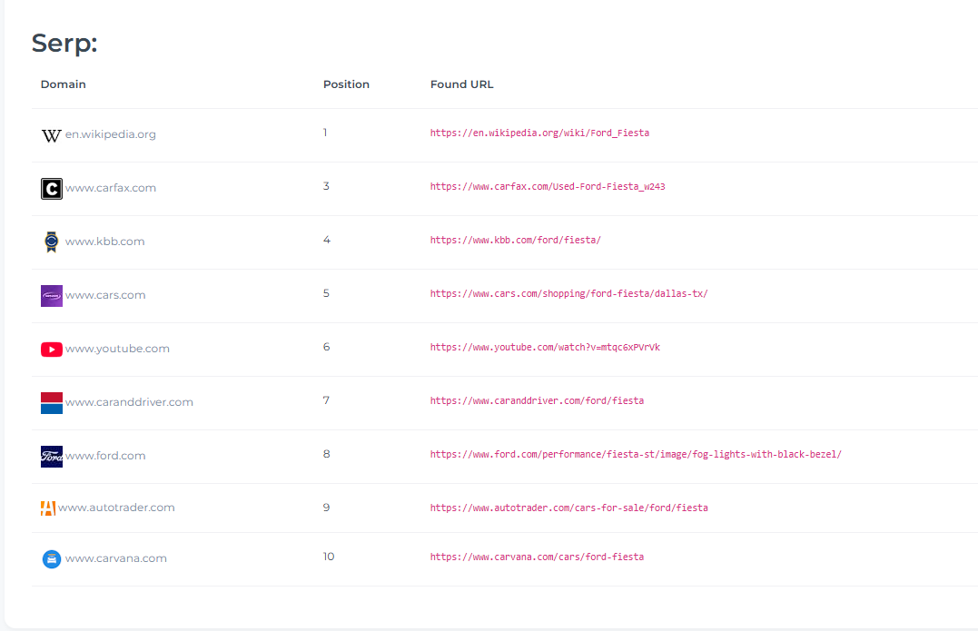 - SERP snapshot — which domains currently rank at the top for this keyword, their positions and found URLs