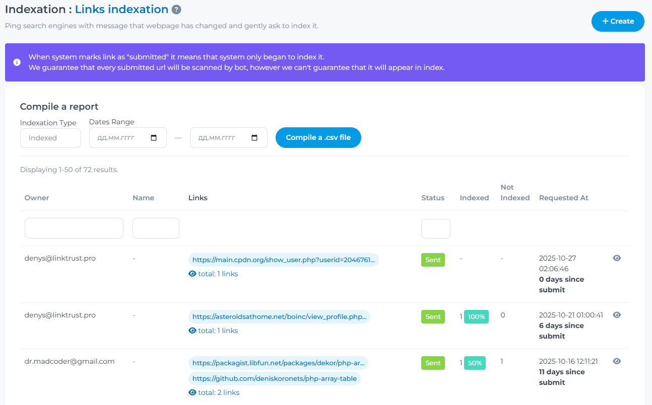 - Переглянути і завантажити звіт по індексації з фільтрами і сотруванню.